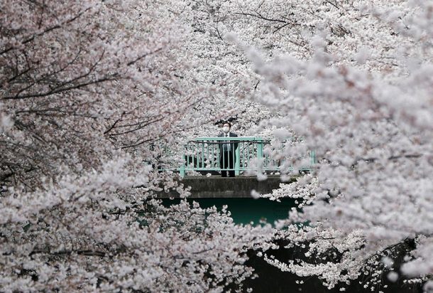 一位日本商人在2016年4月1日在东京盛开的樱花tress。