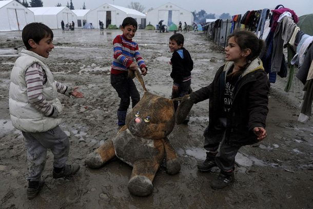 遗忘或只是与可怕的现实达成协议,难民儿童在2016年3月15日在希腊伊多梅尼村附近的希腊 - 马边边界的一个营地玩了一个泥泞的毛绒玩具。