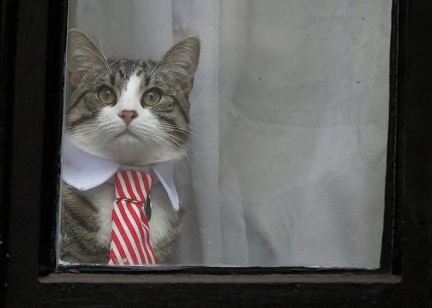 朱利安·阿桑奇(Julian Assange)的猫坐在厄瓜多尔大使馆的窗户上,阿桑奇(Assange)于2016年11月14日对来自英国伦敦伦敦瑞典的检察官英格丽·伊斯格伦(Ingrid Isgren)进行了采访。