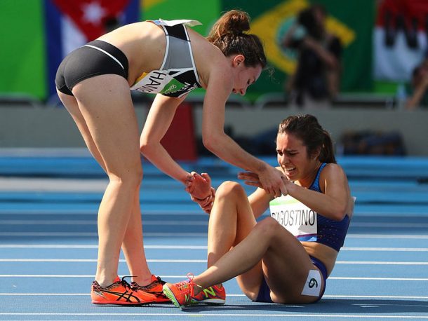新西兰的妮基·汉布林(Nikki Hamblin)在2016年8月16日在里约奥运会(Rio Olympics)参加了5,000m的比赛后,她停下来帮助美国的比赛Abbey d'Agostino,忘记了自己的比赛。