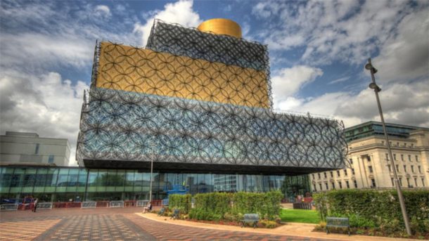 英国伯明翰图书馆坐落于2013年开业。最大的,荷兰的工作室,创造了四个矩形空间,堆在另一个交错排列方式,和空间创造了梯田。指定的图书馆是欧洲最大的公共图书馆,该网站仍是戏剧从1930年代和1960年代之间的建筑。包装,最大的金银丝细工模式创建的金属环-点头珠宝部分在金、银,玻璃外墙。