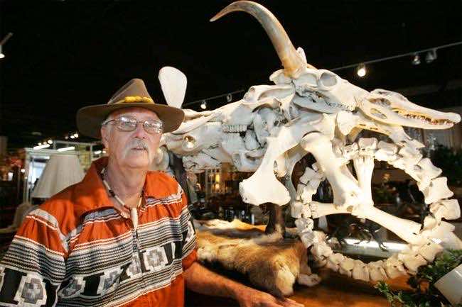 使用过的骨头包括牛头骨、鳄鱼头骨、山羊、狼的骨头和牛的刺。根据摩尔的说法,他花了大约一年的时间收集所有这些骨头,对于尸体,他求助于猎人和农民的帮助。接下来的一个星期我花在打磨骨头和组装自行车上。Reese Moore今年65岁,这辆自行车并不是他唯一用骨头做的东西。他有许多其他模型的名字,包括恐龙和直升机。除此之外,他还是鲸鱼和海狮的训练师,在博物馆展览中工作,如果这一切还不够的话;他还在铁木川印第安重演演出。他也花了一段时间在过去的蛇牧人。