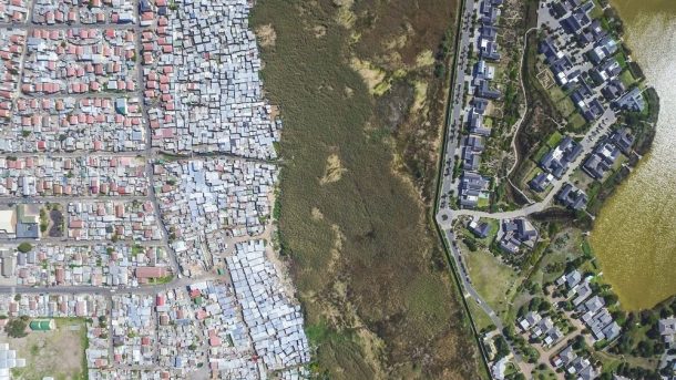 现在住在开普敦的美国摄影师约翰尼·米勒(Johnny Miller)在开始他的摄影系列“不平等场景”时想捕捉到这一点。他告诉城市实验室,“无人机摄影很有趣,因为它为人们提供了他们认为知道的地方的新观点。人类具有这种惊人的能力,可以认为我们知道这种情况,从同一角度看了很多次。它变成了常规,几乎是一种模式。当您飞行时,您会完全改变这一点。我想破坏我感到的自满感,并且我认识开普敦的许多特权人士。”