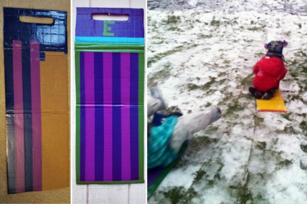 一个折叠的纸板箱,上面覆盖着不同颜色的胶带,制成一个令人印象深刻的雪橇。