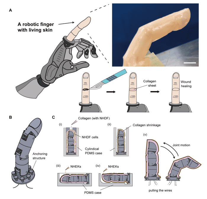 因此,日本科学家周四在《Matter》杂志上表示,他们在这一领域取得了一些进展。他们展示了一种涂有“活皮肤”的机器手指,这是一种由真实的、活的人类细胞制成的皮肤原型。