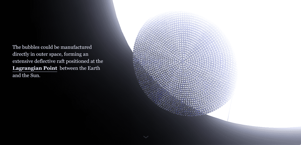 “地球工程可能是我们的最后和唯一选择。然而,大多数地球工程提案都是地球结合的,这给我们的生活生态系统带来了巨大的风险,”专门针对解决方案的网页读取。“如果我们在击中行星之前将1.8%的事件辐射偏转,我们可以完全扭转当今的全球变暖。”