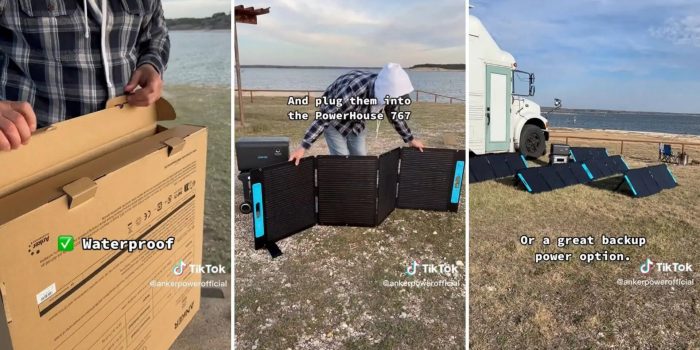 由@ankerpowerofficial共享的视频中,一位代表了方便的便携式太阳能电池板。可折叠的面板,紧凑,容易移动,大小相当于一个大的公文包。此外,他们是可用在任何天气条件,使它们RVers可靠的电力来源。