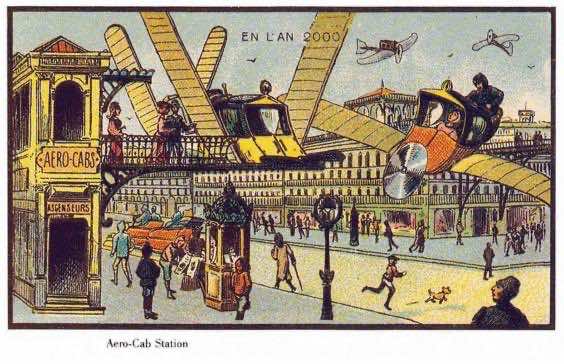 这些带翅膀的小飞机到处都是。当时人们对航空非常着迷,所以这种想象无处不在。这些空中汽车到处都是,甚至被用于大众交通。记住飞机在那个时候还没有发明。在这幅画中,他们可能比我们想得还要早!