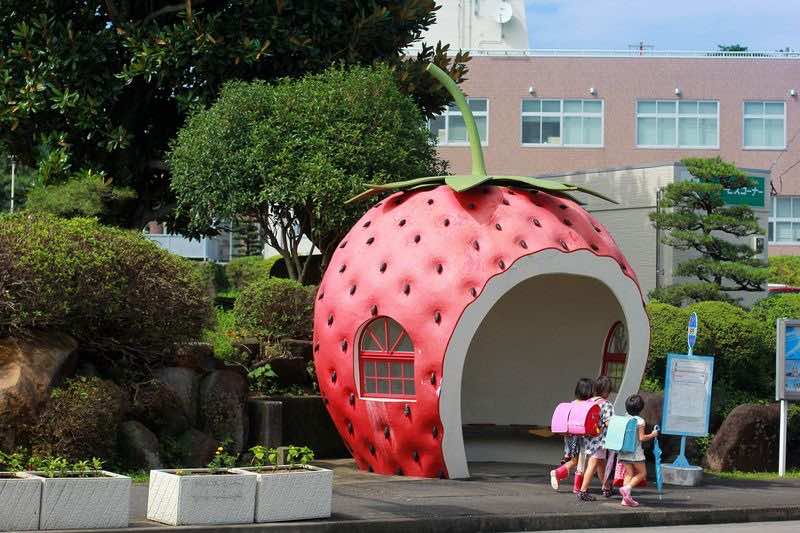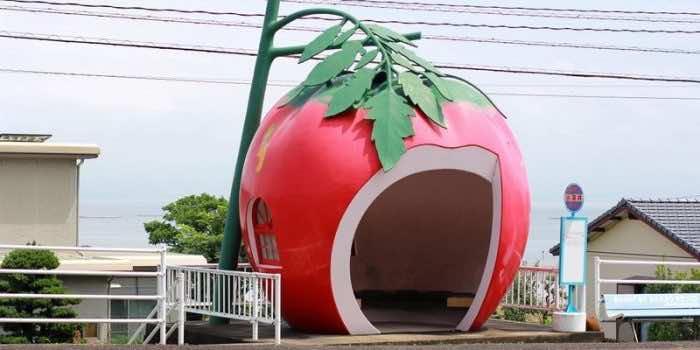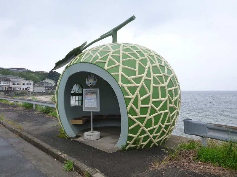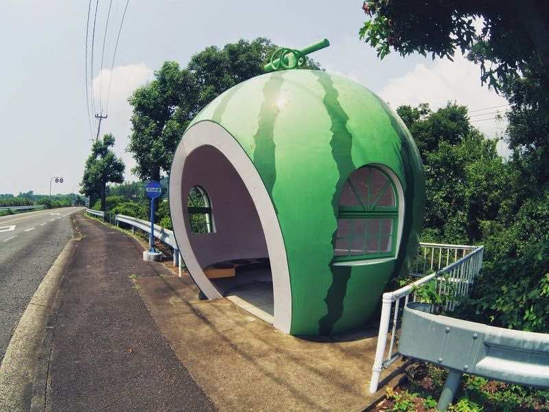 这些惊人的公共汽车站被建造,复制了几种不同的水果,包括西瓜,草莓,橙,麝香和番茄。他们引人入胜的设计的原因是吸引了访问日本参加1990年博览会的游客。