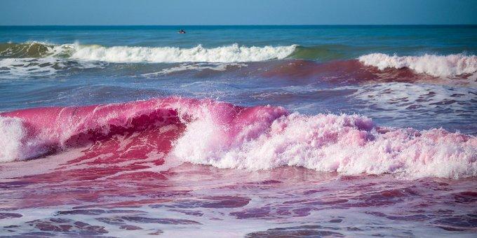 科学研究的名义,一个实验在圣地亚哥海滩是暂时把海洋粉红色。羽毛在近岸的条件下或PiNC pink-hued染料实验由加州大学圣地亚哥分校的斯克里普斯海洋研究所的研究人员和华盛顿大学的探索小淡水外流与冲浪区。