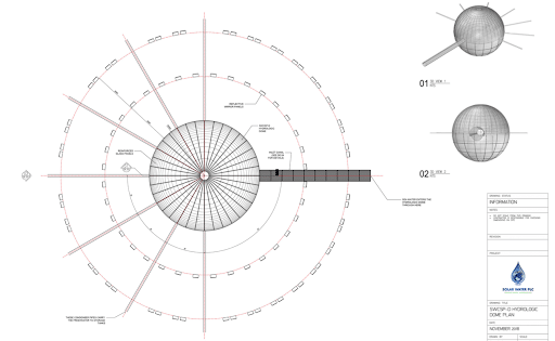 太阳能屋顶植物基本上是一个“钢罐埋地下,覆盖着一个圆顶”,给了一个巨大的球。玻璃圆顶是定日镜反射,反射太阳辐射包围在里面。内的辐射用于加热海水穹顶,蒸发和冷凝形成淡水。根据大卫•Reavley太阳能水CEO,这种技术是便宜,快速构建和也碳中性的,因为它不使用污染纤维与其他海水淡化技术。