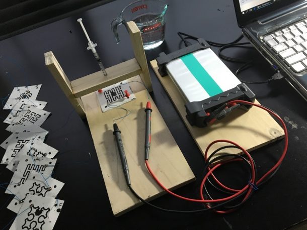 - 用铜垫和铅线制作的传感器(由纳米颗粒导电碳、活性炭纳米颗粒、水和棉纸制成)
