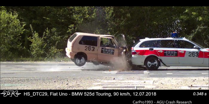 宝马在90 km/h碰撞测试时配备了三个人类假人和一些装备,以观察是否也会造成任何损坏。