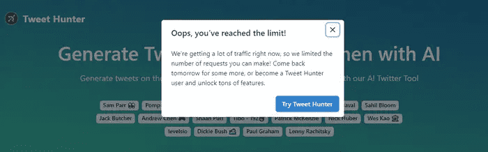 尽管如此,这个推特猎人的人工智能工具已经变得流行起来,偶尔网站会因为过载而无法正常工作。当发生这种情况时,网站可能会停止响应或给您一条“达到极限”的消息。