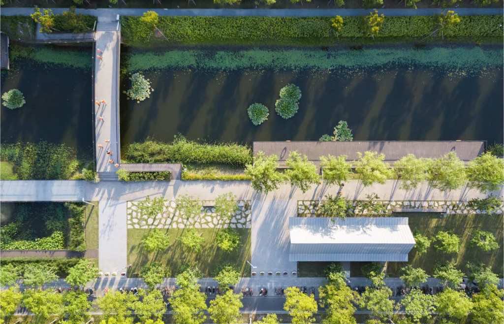 雨水从公园和附近的道路内聚集,过滤后填满了水体。该项目因使用环保材料并意味着可持续实践,例如LED照明和可持续竹子,因此获得了中国绿色建筑奖。