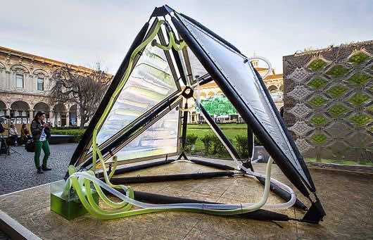 当阳光强烈时,它有助于藻类繁殖并增加它们在水中的存在,使水变成深绿色。当黑色的水在上面流动时,它会产生明显的彩色图案,同时在高温下提供阴凉。展示的顶篷很小,因为它是用于世博会演示的。但是,如果安装像这样的更大的结构,它们可以产生相当于4公顷森林和150公斤生物量的氧气。