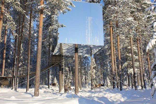 这家奇特的酒店有五个房间,具有独特的个人设计。它们位于距离树木中的Harads村约13-19英尺的高度。乔纳斯·塞尔伯格·奥古斯滕(Jonas Selberg Augusten)的电影启发了这棵树酒店的概念;树爱好者。房间覆盖161至322平方英尺的区域。我们在房间清单中有鸟的巢,镜子和小屋。每个都有自己的独特性。例如,MirrorCube是一个伪装的房间,其墙壁反射周围的树木,而小木屋居民可以通过全景窗户来看卢勒河谷。