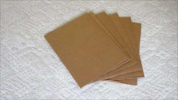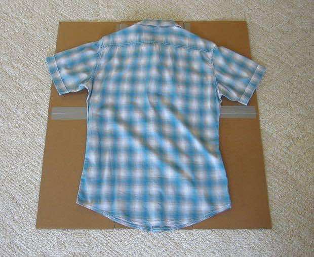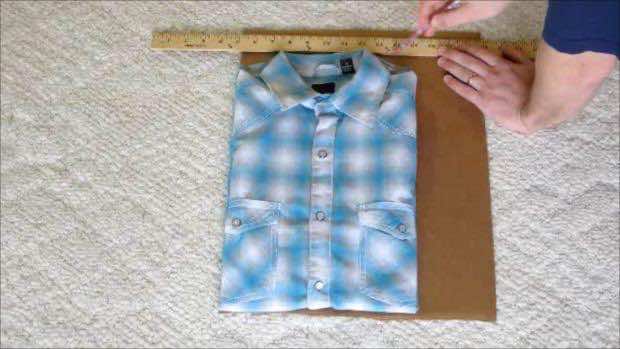纸板的给定尺寸是将被赋予折叠衬衫的尺寸,这是许多商店用于大衬衫的尺寸。或者,你也可以折一个短的,画出如图所示的线,然后用刀切出纸板。确保两边尽可能均匀。