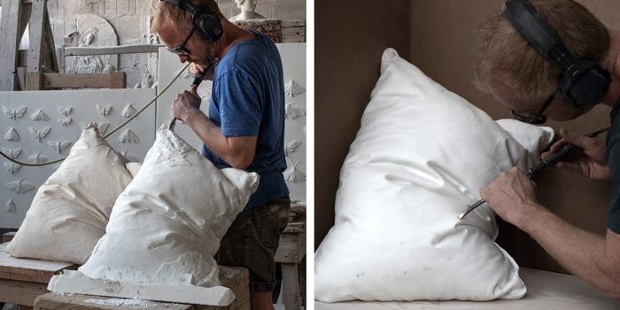 不仅是主要原料,整个配方还使用气动锤和凿子在正确的地方产生正确的折痕。这个令人惊叹的设计超出了正常人的想象,绝对让它看起来像一个普通的羽毛填充枕头。褶皱和折叠的能力,让我们重新思考大理石所拥有的能力。