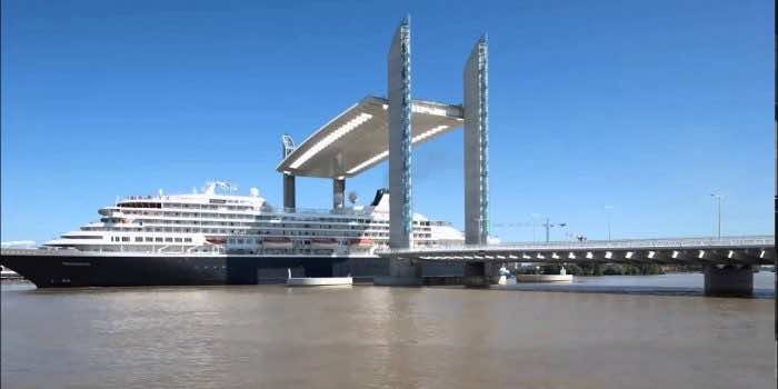 公司SARL克利斯朵夫在algeron组成的建筑和艺术品,查尔斯·拉维妮和他的儿子托马斯·拉维妮,这背后的设计师成功的基础设施项目。桥长575米,433米的主甲板和117 m是中央升降孔。桥的中央部分仍然在一块,但是电梯垂直上升了77米为了让船通过。取消部分桥的重量是2600吨左右。一对塔每一方的吊桥部分延伸77米高,一旦打开,这座桥有110米的间隙通过航道的船只。塔是由混凝土基础,44米长,宽18米,高16.5米。每个基地部分重约1.5吨。这座桥需要11分钟完全提升或降低到位,但可以继续关闭交通长达90分钟为了让更大的船只通过。操作电梯的跨度达到通过高强度绳索通过滑轮连接电梯跨度抗衡。钢丝绳绞车驱动操作系统与电动马达和通量向量再生驱动拖而支付的运用,从而提高和降低电梯。