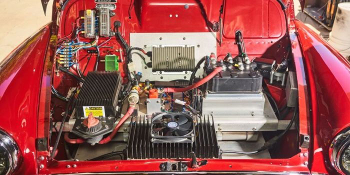 他安装了电池管理系统,电动机控制器,DC-to-DC转换器在发动机舱前面的车。刹车保持一样。