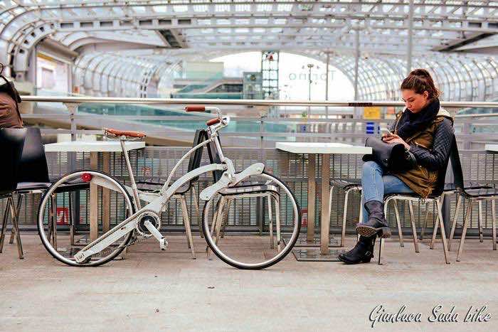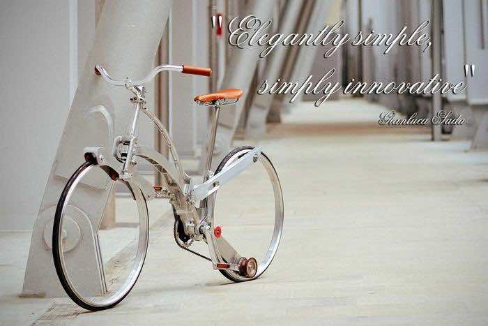 这一壮举背后的设计师是吉安卢卡·萨达,当他看到现有的折叠自行车设计是多么不切实际时,他就产生了这个想法。据他说;“折叠自行车的想法已经进行了大量的研究,重点是减少重量和尺寸,导致自行车太小。”他们有一个小的框架和车轮在牺牲稳定性,为了紧凑和便携性在运输过程中。事实上,车架的最小尺寸会影响车手在驾驶时的位置,而车轮的小尺寸会受到地形变化的显著影响。”