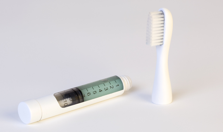 他的小工具中最惊人的方面是可以称为除臭棒和注射器之间的十字架的手柄。您必须使用牙膏填充它,当您打算刷牙时,您需要将底部的几个切口扭转,牙膏被挤出刷毛。最好的部分是,透明塑料的手柄精确地表示其中包含的牙膏量,因此使TSA更容易确定您所携带的量。