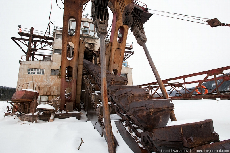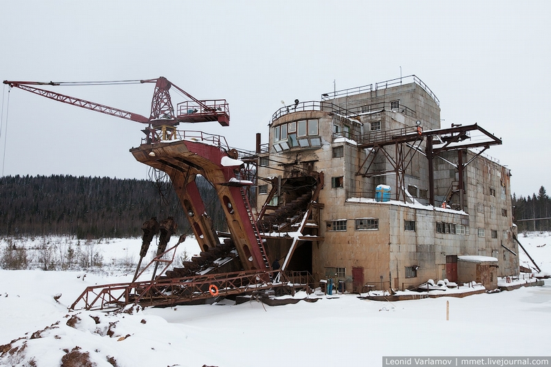 挖泥机利用位于前面的铲子挖出含有钻石的土壤。然后将其放入机器中。在这里,钻石从土壤中分离出来,土壤被输送到后面的一个大管道中。俄罗斯的第一颗钻石就是在这个地区发现的。钻石工业在20世纪40年代开始运作。