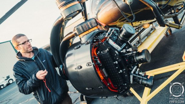 Filming this footage was no small feat. Three RED Weapon 8K VV Monstro cameras with Tokina 35mm T1.5 prime lenses were used by Holland. These cameras were mounted in a Shotover K1 Hammerhead gyro-stabilized gimbal. The cameras were carefully aligned and synchronized to act as a single control unit and the whole set up was rigged up onto a helicopter.