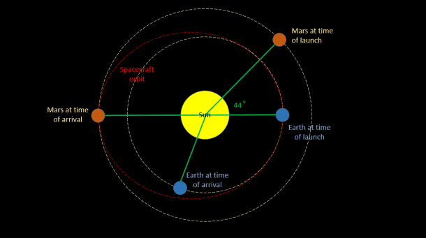 现在轨道操纵穿越火星的轨道,我们需要知道确切的时间飞船得到现在这样火星是那时的轨道。火星比地球的轨道。更多的需要时间to移动相同的角距离火星比地球。宇宙飞船应该推出这样一个时候,火星是地球之前。