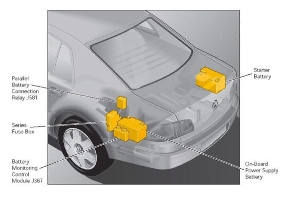 辉腾有两个汽车电池。一个起动电池和其他电池配件。在情况下,起动电池失败,附件电池不得不接管。