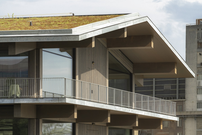 浮动办公室的面积为3606平方米(约38800平方英尺),有一个大露台,共三层。上层设有悬挑阳台,为室内遮阳。它还有一个绿色的屋顶。在结构上,它由木材制成,以最大限度地减少碳足迹。该结构由15个定制的混凝土浮筒支撑,连接形成稳定的浮动基础。