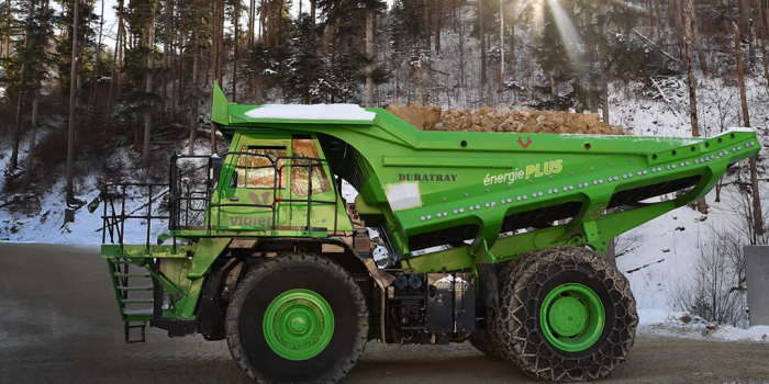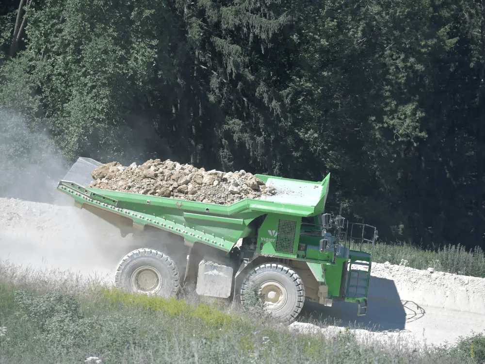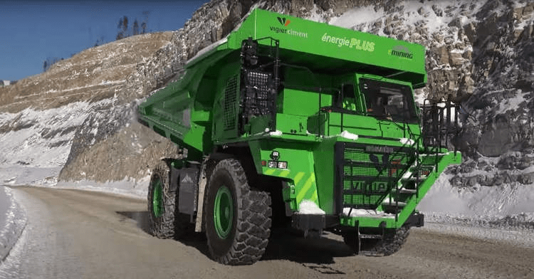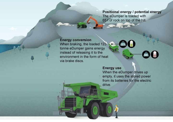 这个采石场为采石场提供了一个千载难逢的机会,可以产生几乎所有运转所需的电力。卡车在采石场装载大约60吨的岩石,然后把它们运到山下的卸货点。13%的下降坡度,加上它背上的巨大重量,使它可以在下降的过程中为电池充电,产生的能量几乎足以将空卡车运回采石场。