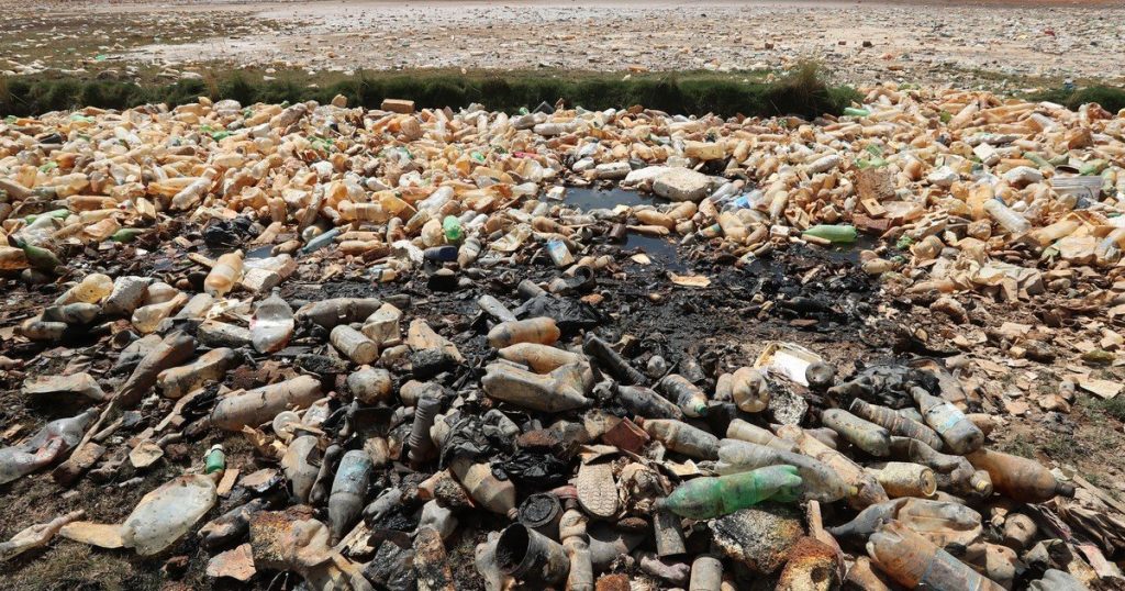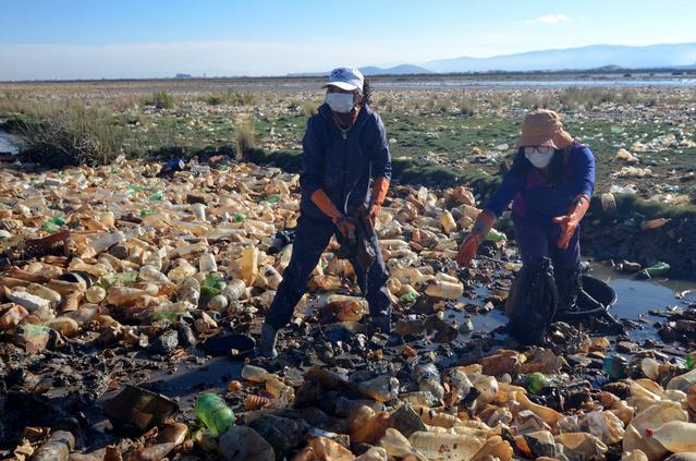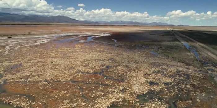 他说,“我们沉浸在塑料垃圾中”,背景是充满垃圾和其他废物的干涸湖床。“除了塑料,圣何塞矿释放的酸性水也在影响景观。”