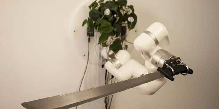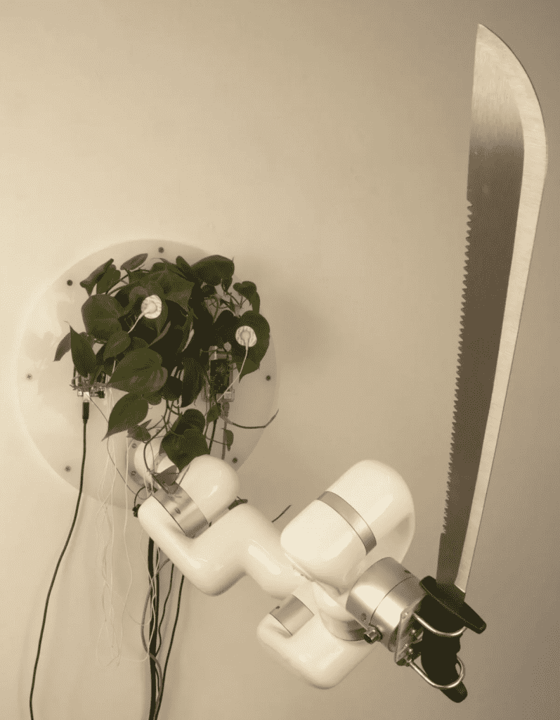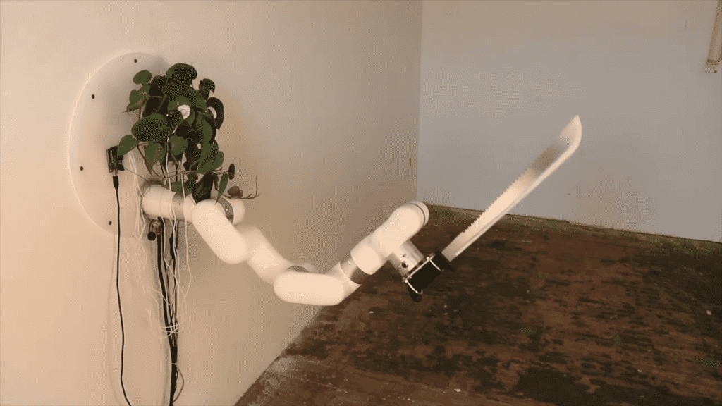 因此,为了将机器人的动作转化为实时技术,使用定制软件从植物中提取砍刀的动作,并以令人印象深刻的方式呈现出来。爱游戏ayx体育你会惊讶地发现,弯刀的所有动作都是由植物控制的,因为它就像机器人的“大脑”,决定何时摆动、刺击和在空间中相互作用。然而,工程师们已经开发了许多类似的技术,通过大脑信号来控制机器人。
