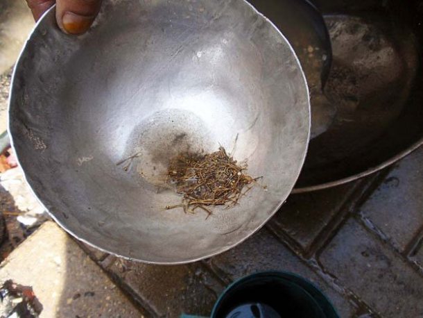 他要做的就是使用筛子并将其放在泥泞的污水中。他通过这件小石头收集了小石头,然后通过碗的内容物进行冲刷,从其余的碗中挑出微小的金颗粒。