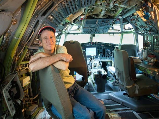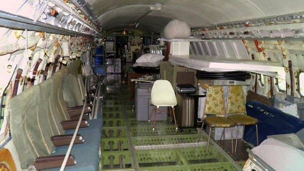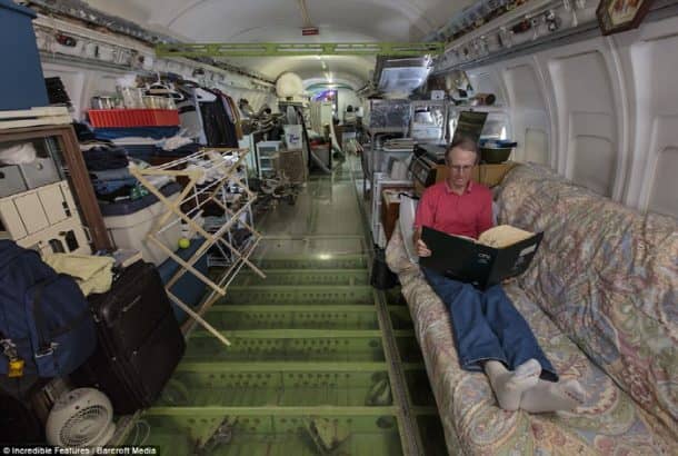 飞机上有足够的空间,但布鲁斯在飞机里过着简朴的生活。他睡在蒲团上,用微波炉和烤面包机做饭。他主要吃麦片和罐头食品,并建造了许多临时设备。这架飞机还有两个可用的厕所,但最酷的是它的淋浴。它建在飞机尾部附近。