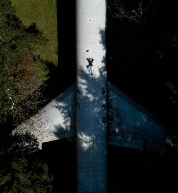 布鲁斯20岁出头的时候,在俄勒冈州希尔斯伯勒的森林里花了2.3万美元买了一块10英亩的土地。从很小的时候起,他就喜欢摆弄旧物品,并用它来创造新物品。他的想法是在他购买的土地上建造一个家,但当他看到那里已经建造了另一个房子时,计划改变了。他听说了来自密西西比州的美发师Joanne Ussery的故事,她买了一架波音727飞机,并把它改造成了自己的家。