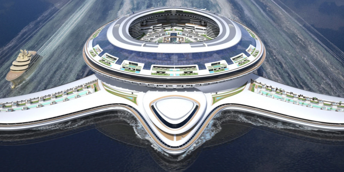 terayacht将19私人别墅和64套公寓在每个海龟。这将是由九个高温超导电动机供电,每个16800马力,让巨大的结构的速度巡航五节。