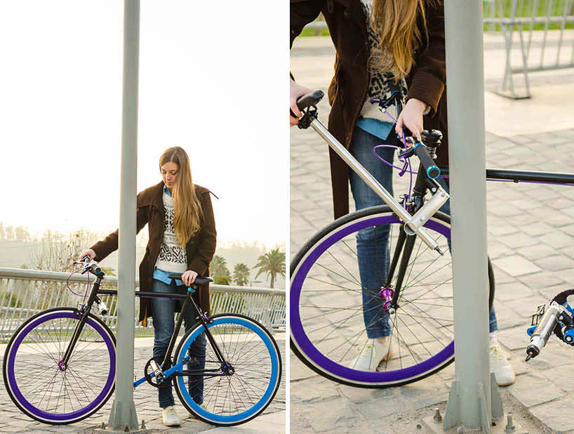 So the frame is basically a lock; the frame’s down tube can be opened out in order to make it position around a solid object, lamp post perhaps, and the saddle and the post are then inserted through the open ends in order to complete the lock. The attempts to steal the bike would result in damaging the frame and hence, shall render the bike useless. The whole process of locking takes only about 20 seconds.