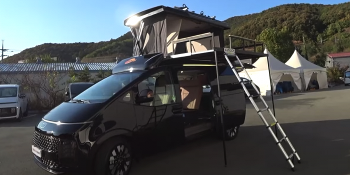 The Korean conversion shop, Vantech has launched its Raccoon L which is a small camper that is the world’s first Staria camper van with unique features like a novel layout, electric pop-up sleeper roof, slide-out sundeck, and swing-out tailgate microwave.