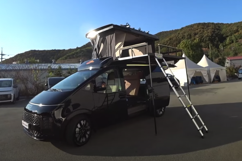 The Korean conversion shop, Vantech has launched its Raccoon L which is a small camper that is the world’s first Staria camper van with unique features like a novel layout, electric pop-up sleeper roof, slide-out sundeck, and swing-out tailgate microwave.