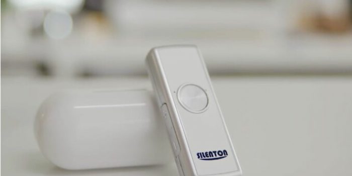 Silenton设备是由韩国Suhyun科技公司开发的,它的收发器被设计成夹在用户的衣领、安全帽、项链或嘴巴附近的其他地方。它通过蓝牙与他们的智能手机和耳塞(或耳机)无线连接。