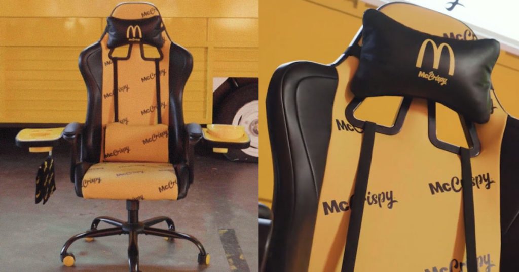 麦当劳为电子游戏迷推出了一款名为“脆皮终极游戏椅”的游戏椅。这把游戏椅是为了庆祝新推出的脆皮鸡肉汉堡。这把椅子涂上了防油处理,这意味着你可以想吃多少麦当劳汉堡就吃多少,而不用担心餐后椅子的状态。它的一个可调节臂上还有一个专门的加热器,可以用来保持你的汉堡既热又好吃,也可以用来储存各种各样的其他食物。当你吃完后,盘子下面的支架是悬挂麦当劳品牌餐巾纸的完美位置。
