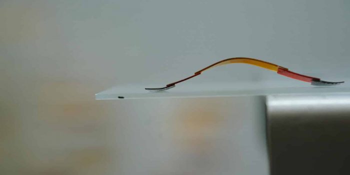 这使得这个长4厘米、宽3毫米、厚1毫米的机器人可以在不连接电源的情况下爬上垂直的墙壁和穿过天花板。