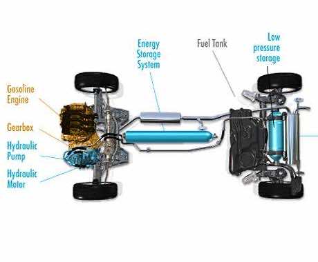 空气-汽油混合动力传动系统的工作原理是在加速过程中从储能系统中释放高压氮气。存储系统推动液压油,驱动与该电机相连的液压马达。当汽车减速时,空气被压缩并储存起来,利用再生制动或部分汽油发动机的动力驱动液压油进入蓄能器,并在氮气返回能量储存系统时对其重新加压。