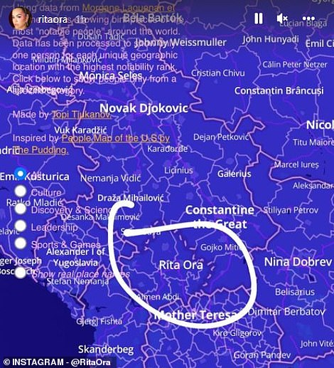 丽塔·奥拉(Rita Ora)出生于普里斯蒂娜(Pristina),南斯拉夫(Sfr Yugostlavia)(现代科索沃),在她的Instagram故事中发布了MailOnline文章的屏幕截图,以及一张地图的照片,显示她是她家乡最著名的人之一。