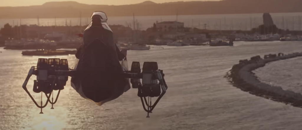 该桶座已封装在这台飞行机器中,为其被称为“飞行甲板椅”,由碳纤维组成,并由发动机的推力供电。然而,机身,推进控制,标题为“飞行”和高度自动化的控制系统类似于小型多功能器无人机,但是将其与无人机和其他类似技术区分开的东西是喷气机涡轮发动机。该模型还与梅曼航空航天的快速飞行摩托车,但它也能够以超过250 km/h的速度飞行。