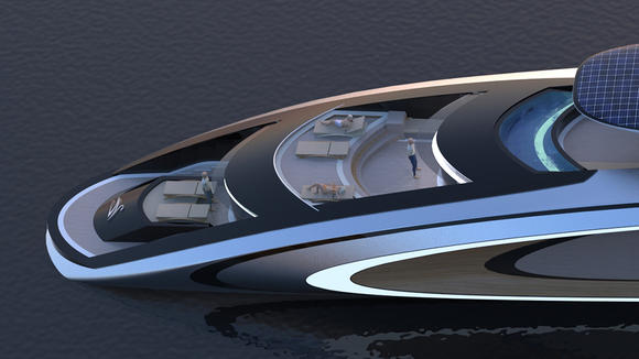 设计顶部的太阳能电池板的顶部有足够的空间,这可能会以安静且生态可持续的方式为这艘游艇提供动力。此外,中心的挖出孔还包含天窗,可以增强房间的美丽,主要是当月光流向下层甲板上时。