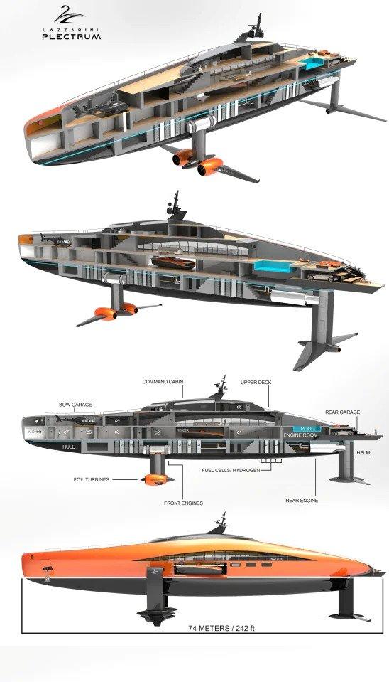 箔系统可以调整根据巡航需要和可以改变宽度从49英尺(15米)的光束,闭着衬托游艇停泊时,高达65英尺(20米)的光束在游艇上高速航行。它有6个客人小屋连同一个船东套件,一个游泳池和一个停机坪。它还包括一个直升机机库,中央车库,可以容纳两个投标,后面的车库水玩具,和一个超级跑车。